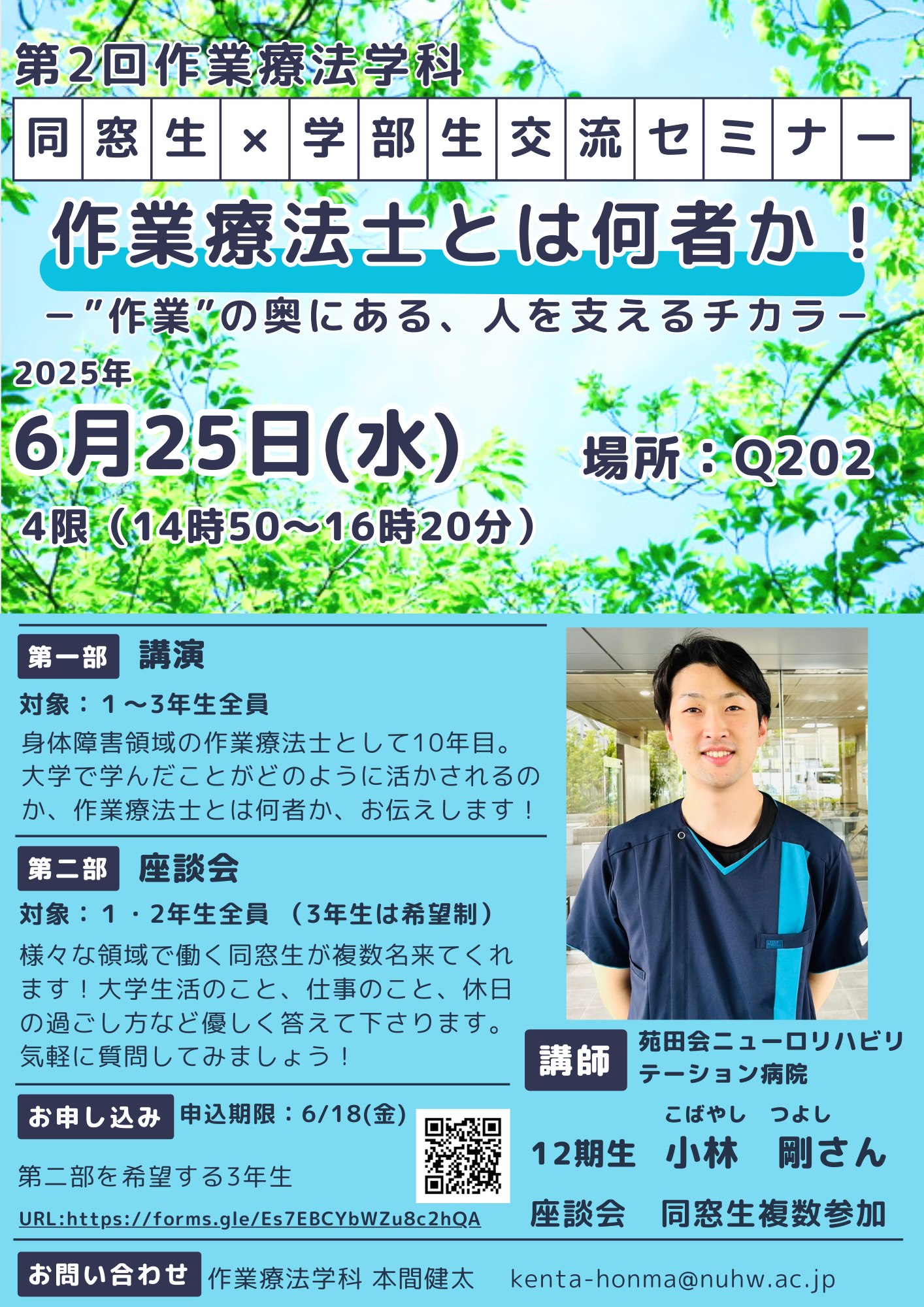 2025年6月に第2回同窓生×学部生交流セミナーを開催しました。今回は、苑田会ニューロリハビリテーション病院で活躍する12期生の小林剛さんをお迎えし、作業療法士が「その人の価値観に寄り添い、日々の作業をその人らしく行えるよう支援する専門職」であることを、ユーモアを交えながらお話しいただきました。後半の座談会では、8名の同窓生と学部生が小グループに分かれて交流し、進路や学びについて理解を深める時間となりました。