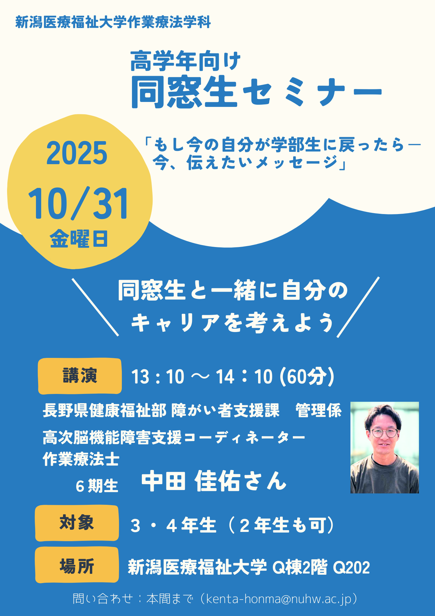 さらに10月には、初の「高学年向けセミナー」を開催し、長野県庁で高次脳機能障害支援コーディネーターとして勤務する6期生の中田佳佑さんに、学生時代の疑問を臨床で探求し続けた経験や、現在のキャリアに至るまでの歩みを率直に語っていただき、学生にとって大きな刺激となりました。