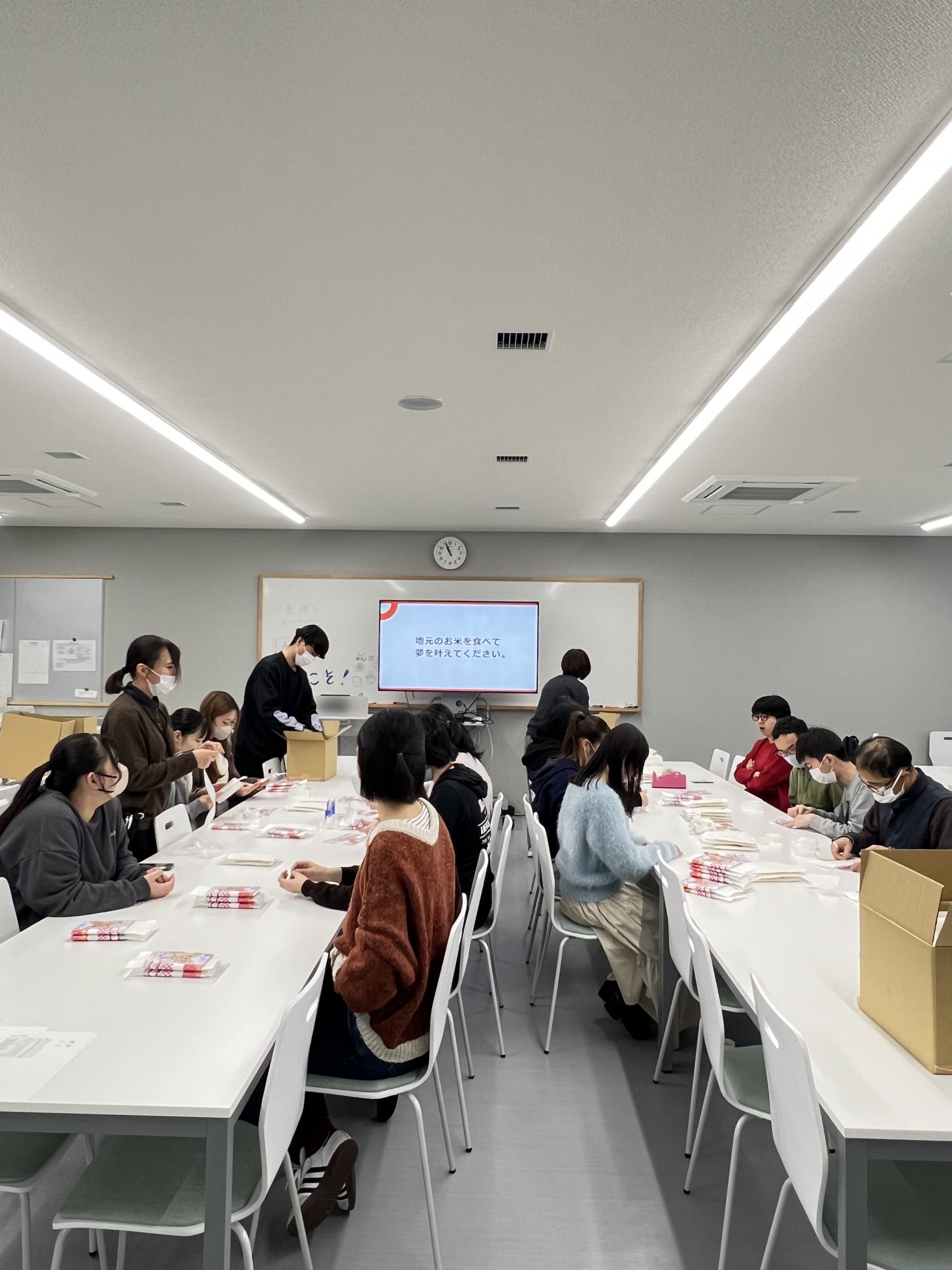 さらに、のし紙は学生ボランティアとクローバーの利用者さんで貼り付け作業をおこないました。